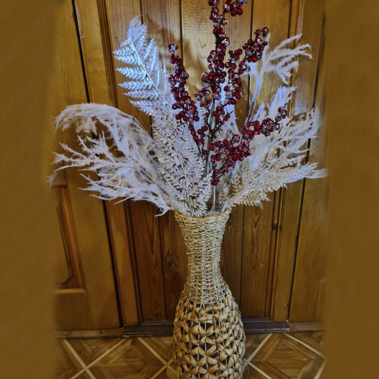 Размеры веточек: красная - 95 см, белая пушистая - 90 см, белая из листьев - 100 см. Размеры вазы: высота - 55 см, диаметр самой широкой части - 19 см, диаметр самой узкой части - 8 см.